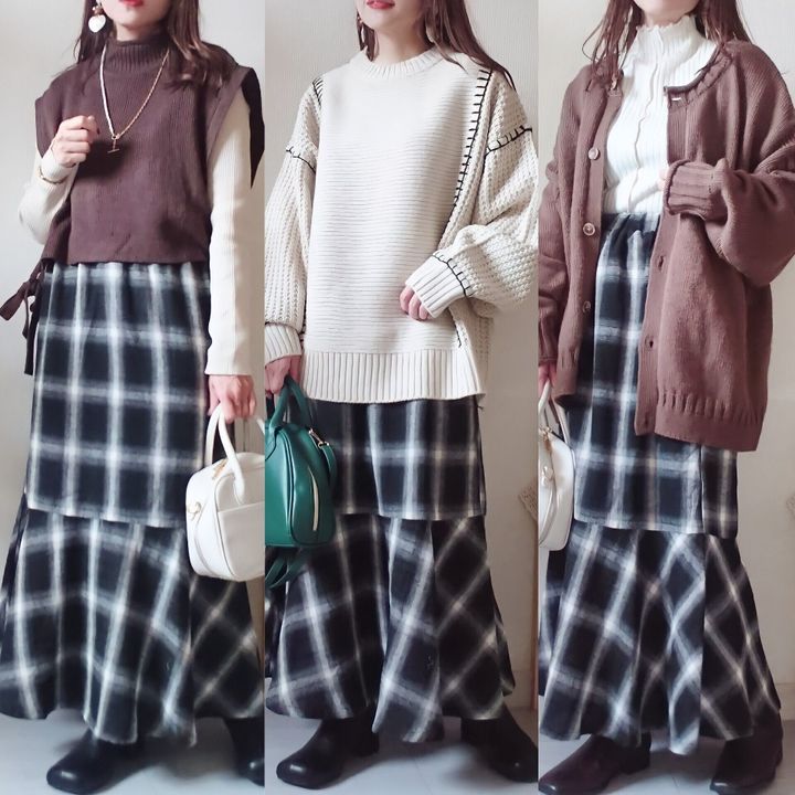 ホワイト系トップスとの相性は抜群です!画像のようにプルオーバーだけでなく、カーディガンコーデ、そして今期大注目のレイヤードニットでのコーデもしてみました。