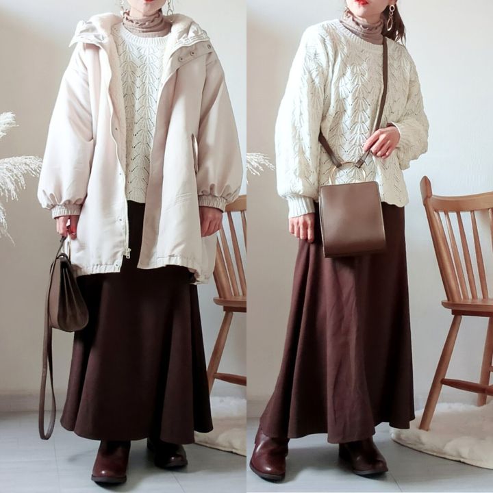 スカートコーデにも合うんです!こちらのトップスはフェミニン感強めの透かし編みニットですが、こうゆうのも可愛いないですか?ポイントは小物でトーンダウン、ブーツはスカートと近いカラーの方がバランスがいいと感じました。