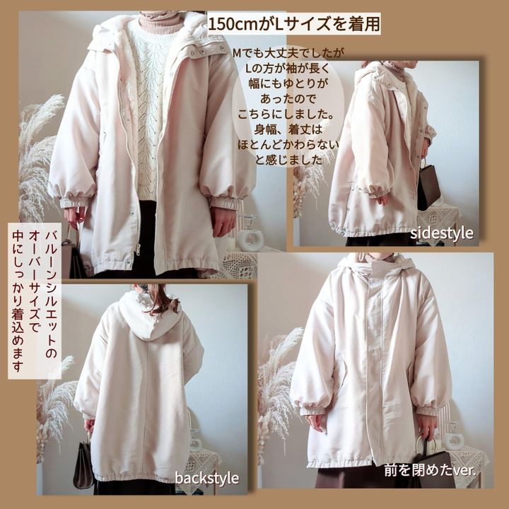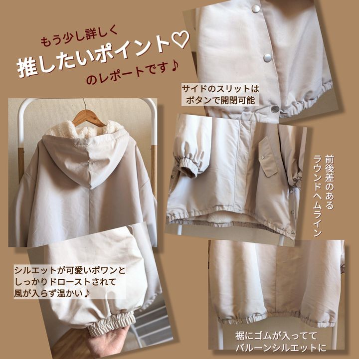 全体的にオーバーサイズなバルーンシルエットとなっています。大きなフードと袖もバルーン袖、サイドにはスリットとボタン付き、こちらは開閉できるようになっています。前後差のあるラウンドヘムラインで羽織るだけで、抜き襟をしたような着用法が叶います。中は厚みのある裏ボア素材となっていてとても暖かいです。またオーバーサイズなので中にしっかり着込めて、防寒対策もばっちりです。