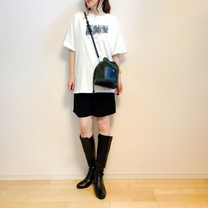 まだ暑さの残る日に、5分袖Tシャツにバミューダパンツ、ロングブーツと合わせて持ってみました。季節の変わり目で暑いから、秋服はまだ着たくないけど秋っぽさは取り入れたい、というような時に、小物で秋冬ものをプラスすると季節感が出てオススメです。