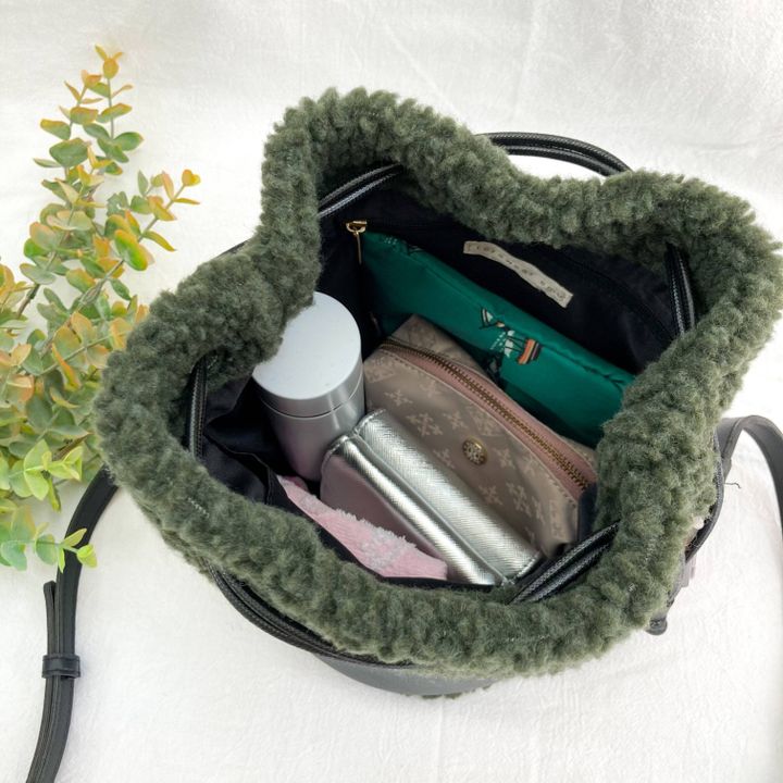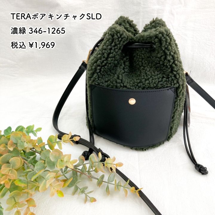 大人気インフルエンサー・てらさんと、しまむらのコラボブランド【terawear emu】の新作バッグです。深みグリーンのもこもこボア生地がとても可愛い!