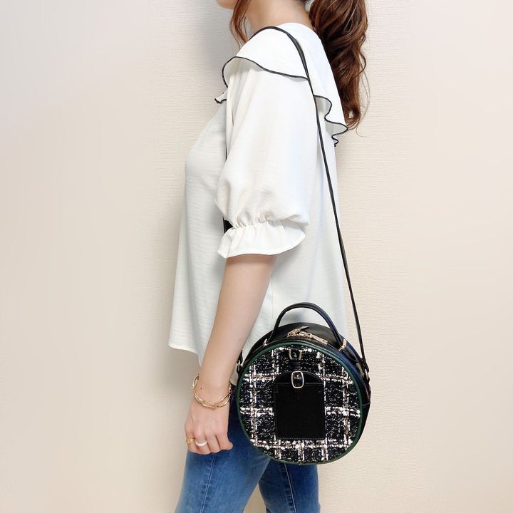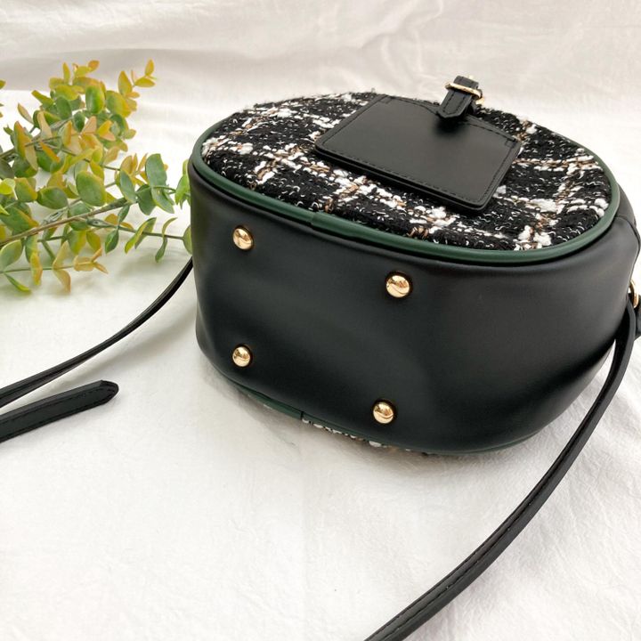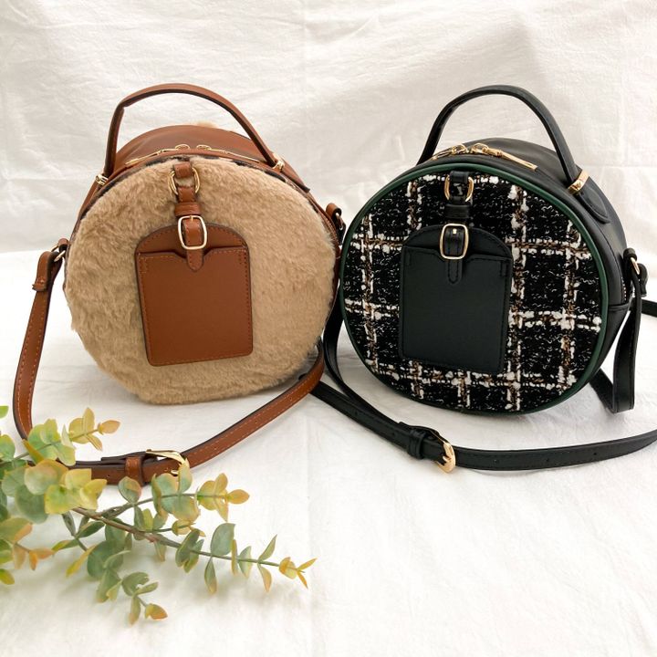 合皮とツイード生地が使われているサークル型ショルダーバッグ。