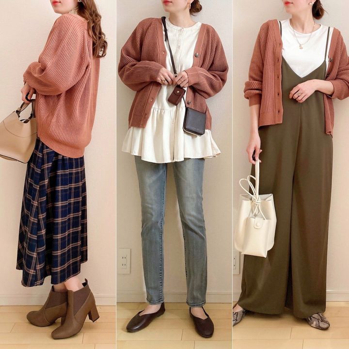 とろみのある落ち着いたカーキのサロペットと合わせてみました。オレンジピンクのカーディガンはアースカラーとの相性も抜群。カーキとの組み合わせは温かみがあり秋冬にぴったりです。足元にはパイソン柄を投入して少し辛口に。