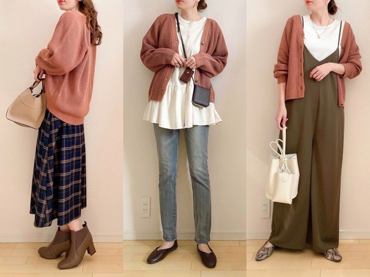 カーディガンの丸みを帯びた後ろ下がりのシルエットがとても可愛いですね。
