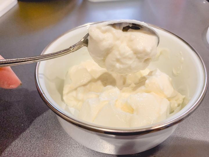 しっかり水切りされることによって、こっくりとした濃厚ヨーグルトになるんです。食感はまるでクリームチーズのよう、、、我が家はクリームチーズ買うのちょっとお高いのでこれで代用することもあり(小声)(カプレーゼ風にして食べるのまじおすすめ