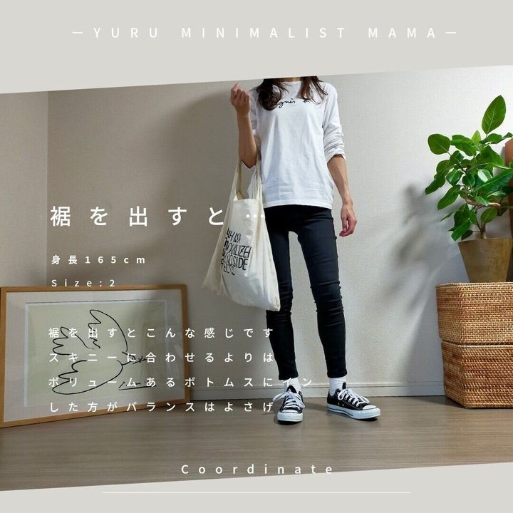 ボリュームのあるボトムスにインして着るほうがバランスがよいかもですね。