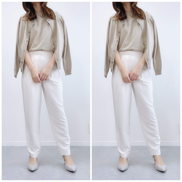 アンサンブルと合わせて綺麗めコーデを意識してみました。オフィスカジュアルにも使えるアイテムだと思います。ヒールのある靴と合わせるとより脚が綺麗に見えますね。