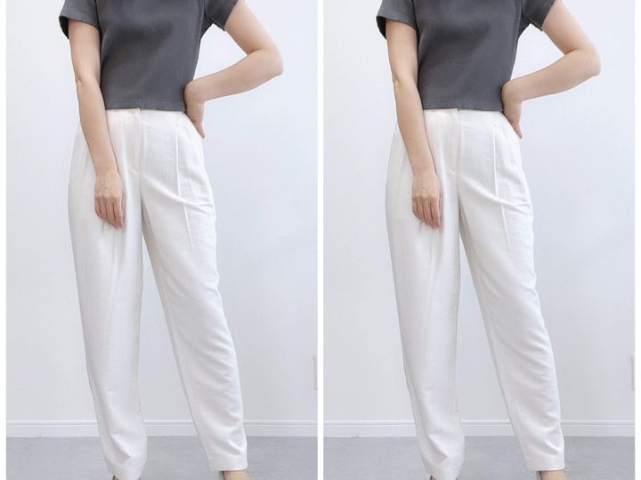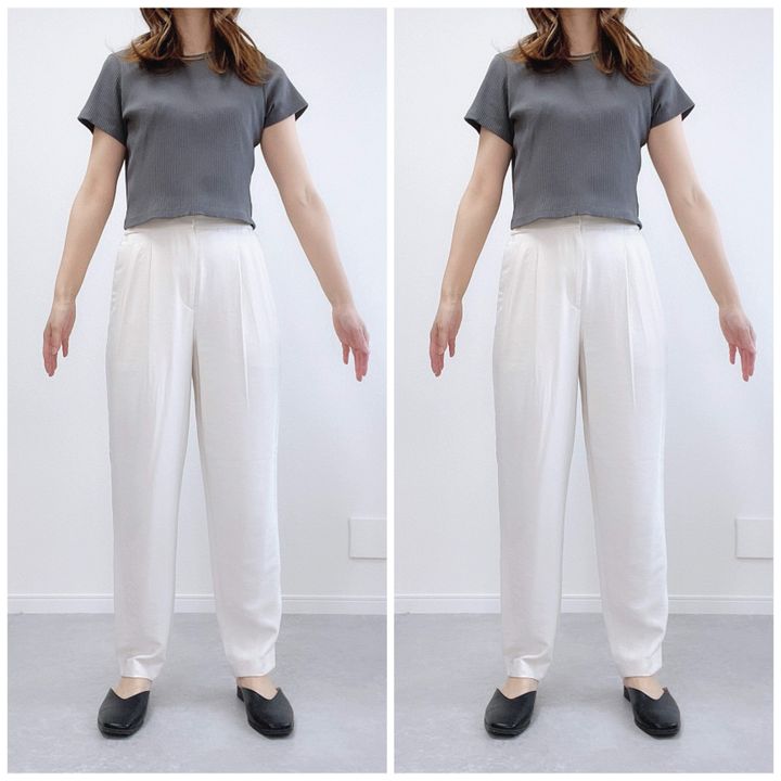こちらのパンツはゆったりしていて楽ちんなのにカジュアルにも履けるし綺麗めにも履けちゃいます。下半身にボリュームがある私ですが腰周りのタックのおかげで気になる腰周りをカバー。太もも周りはゆったりした作りですが裾にむかって細くなるテーパードタイプのため脚を綺麗に見せてくれます。いつもMサイズを選ぶことが多いですが太もも部分の太さがSサイズの方が好みだったためSサイズを選びました。サイズによってここの太さは変わります。ウエストも他のボトムに比べて少し余裕があると思いました。