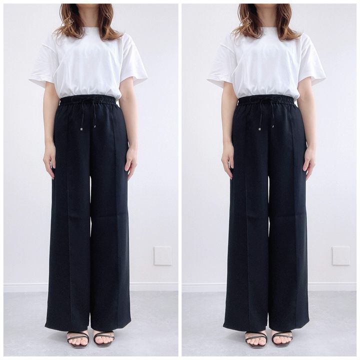 こちらのパンツはとにかく履きやすいです。ゆったりシルエットなので脚が楽ですしウエストはゴムですが紐が付いているのでウエスト位置が調整しやすいです。ゆったりシルエットですがセンターピンタックといってパンツの真ん中に立体的なラインが入っているのでその効果で脚がきれいに見えます。