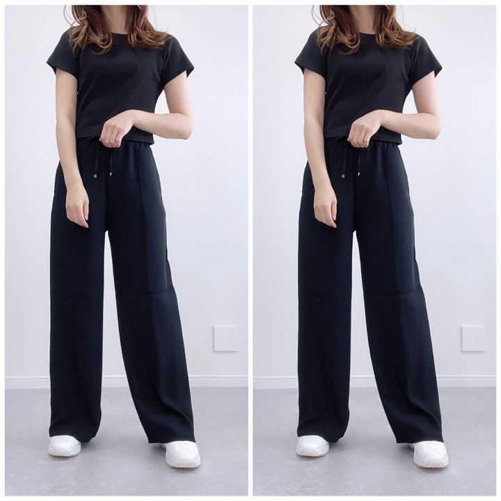 流行りのクロップド丈トップスと合わせてみました。ウエスト部分に紐が付いているので少しパンツを上げて履くことができます。なので短めの丈のトップスでも合わせやすいと思います。