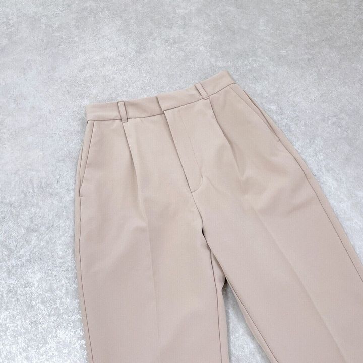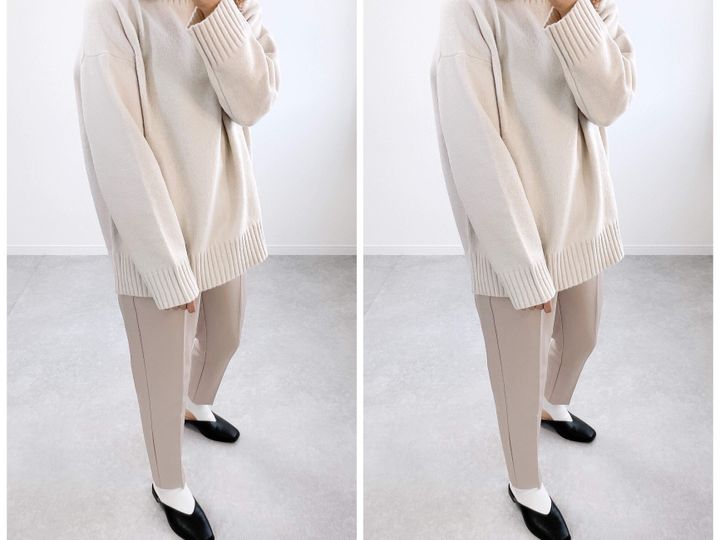 こちらのパンツは履きやすいのに細見えして美脚になれる素晴らしいパンツです。試着した時に脚が細く見えたのに感動して思わず声がでそうになったくらいです。裾にむかって細くなっていくテーパードタイプなのと、センタープレスが入っていて脚を立体的に見せることで脚が細く見える、美脚、両方叶えられるパンツになっているのだと思います。