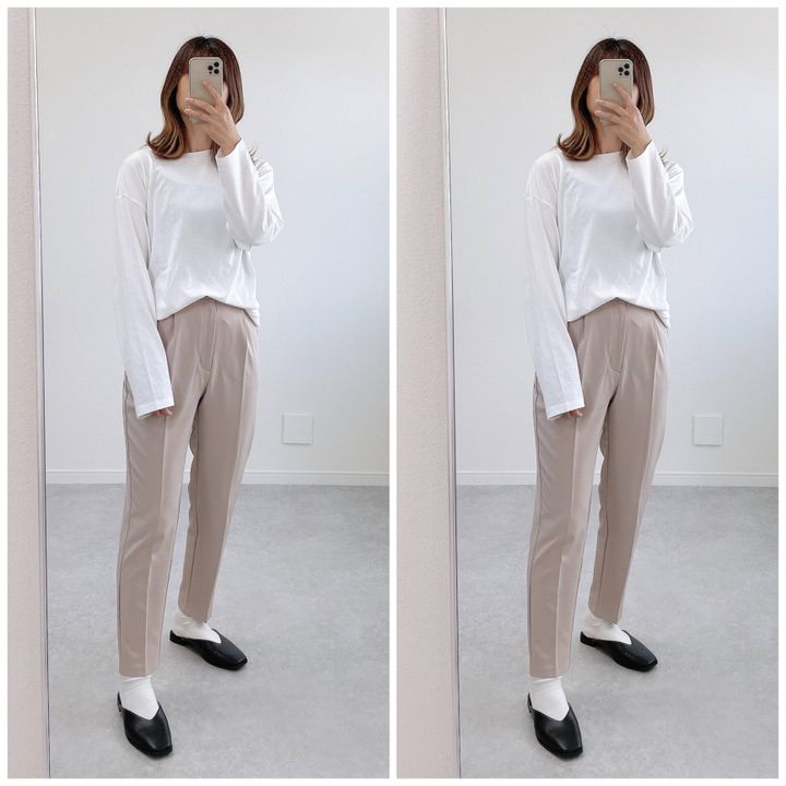 最後はシンプルなカットソーに合わせてみました。私のイメージですがあまり厳しくない職場だとこんな感じでカットソーと合わせて着てもいいのではないかと思いました。このパンツはオフィスカジュアルとして色々と使えると思います。