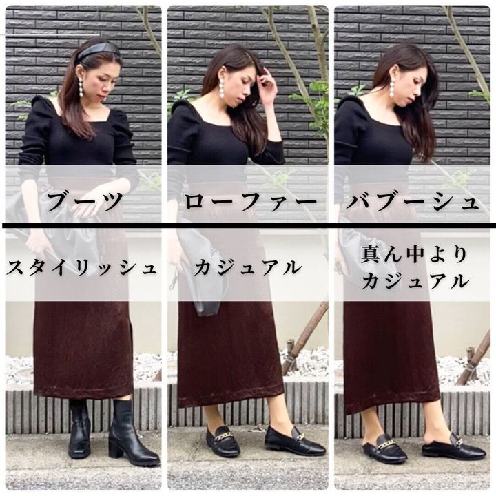 ブーツはスタイリッシュ、ローファーはカジュアルな印象になりますね。