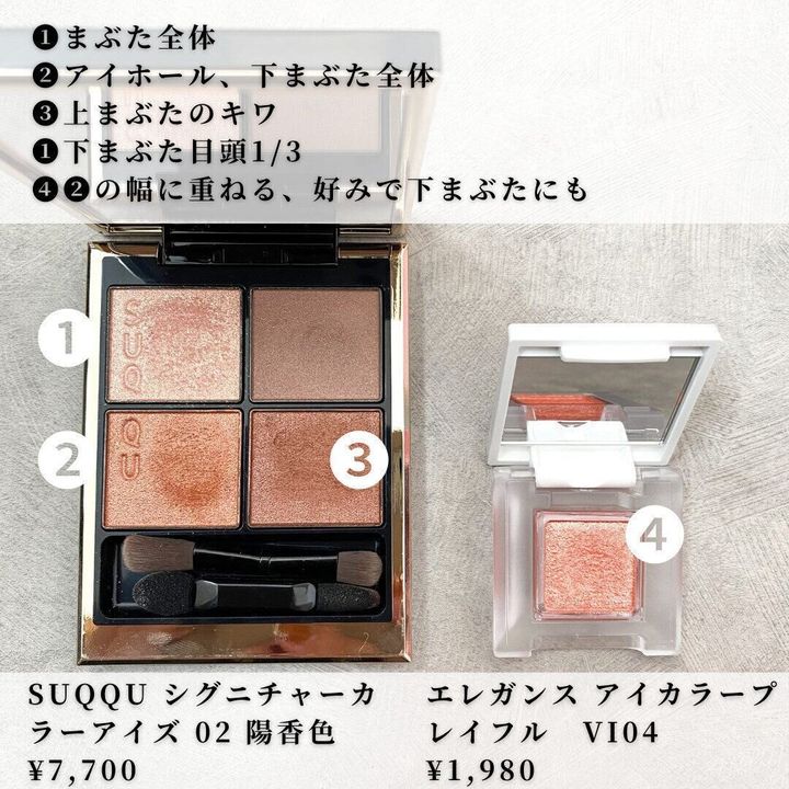 私は写真のとおりに塗っていくことが多いです。①~③だけだと、私には黄みが強くて、顔色が悪く見えます。そんなときはエレガンスのオレンジアイシャドウを上から薄く重ねるだけで、顔色がよくみえるのです。
