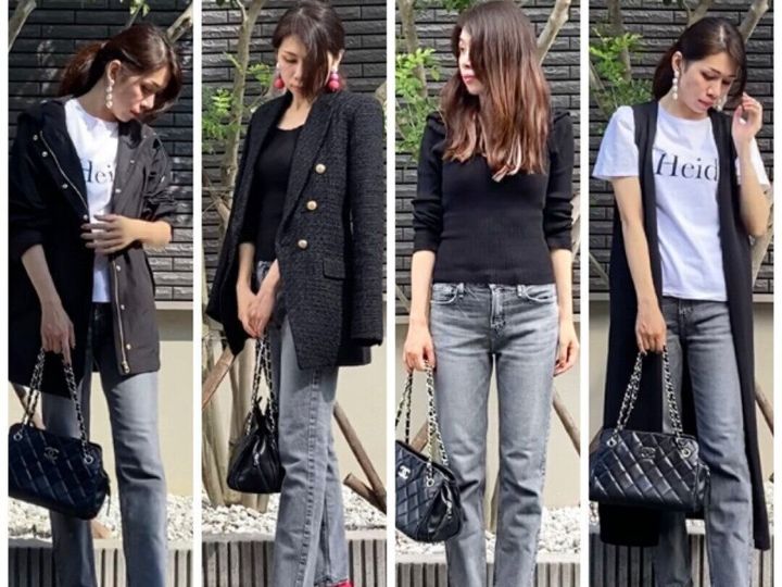左から2番目はホテルのアフタヌーンティーにも行けるくらいのきれいめ具合。シンプルコーデにジャケットを羽織るだけで、きちんと感がでますね。