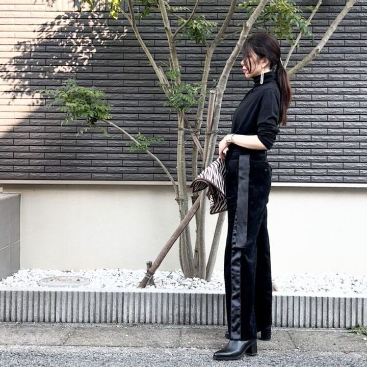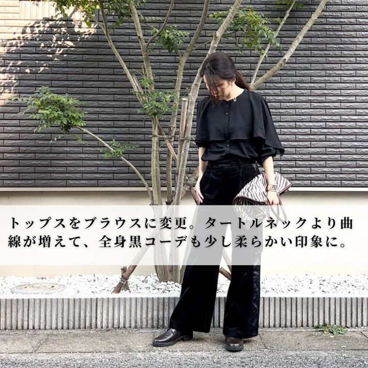 トップスをブラウスに変更。タートルネックより曲線が増えて、全身黒コーデも少し柔らかい印象になりました。