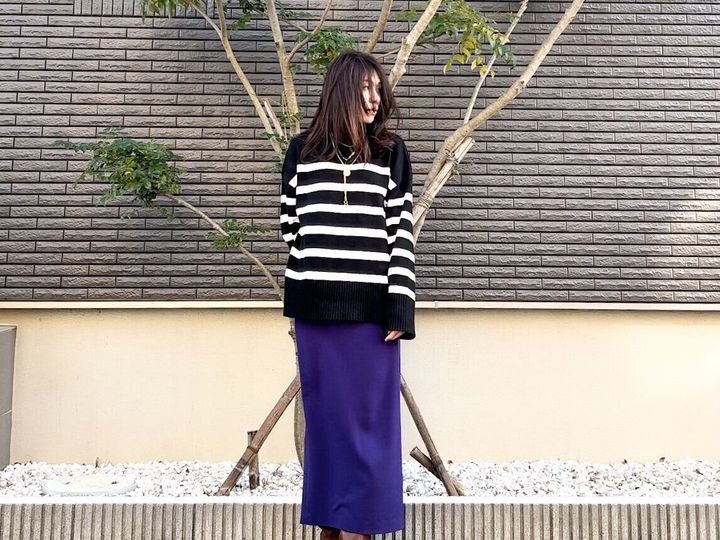 私は細めのボーダーだったり、コットンのようなカジュアル素材だと、ボーダーが野暮ったく見えてしまうのですが、そんな私でもこれはスタイリッシュに着こなせました。