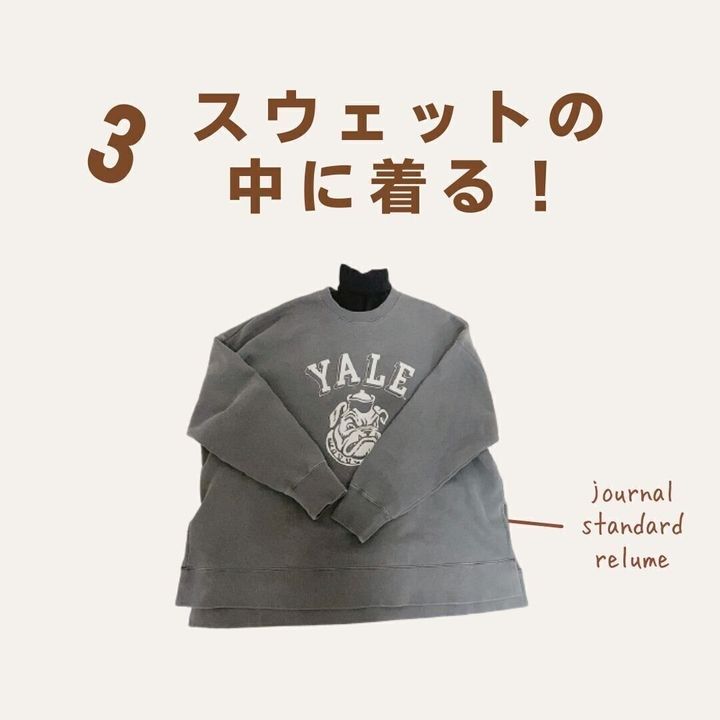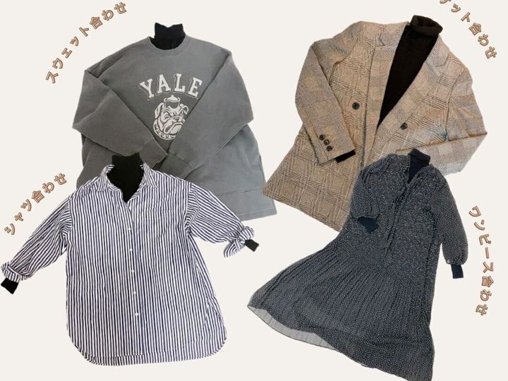 タートルネックニットを"中に仕込む"ことで様々なコーディネートを楽しむことができます。