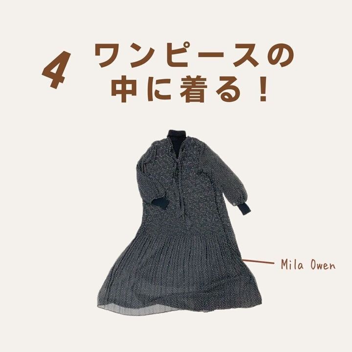 薄手のワンピースでも、中にタートルネックニットを入れることで冬でも着られるようになります。
