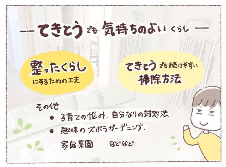 「適当でも気持ちのよい暮らし」をテーマに生活の工夫など幅広いジャンルの記事を書いています。SNSではイラストエッセイを発信中。
