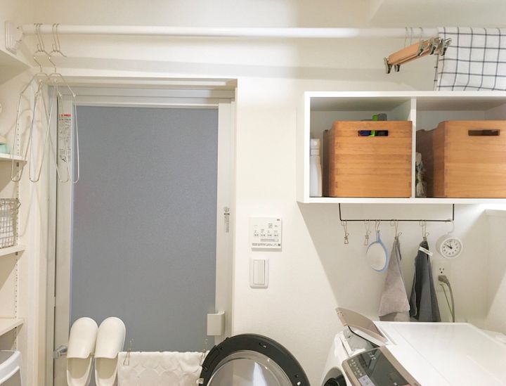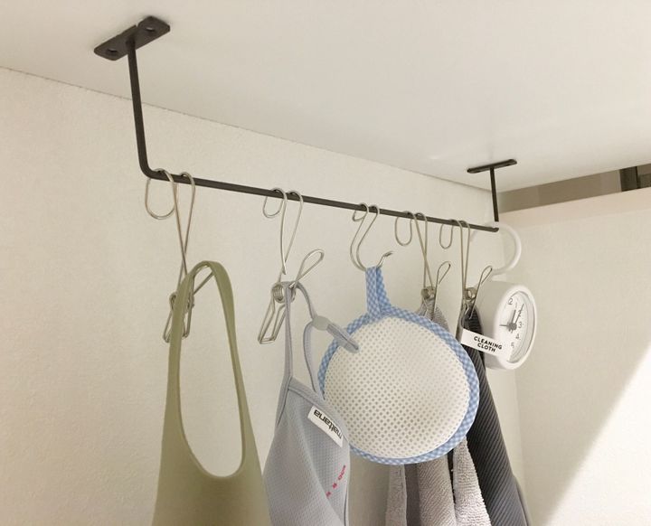 我が家は棚の下にバーをつけ、布巾や洗濯グッズの一時保管場所としています。取りやすい場所にあると「ついで掃除」がしやすいのでおすすめです。