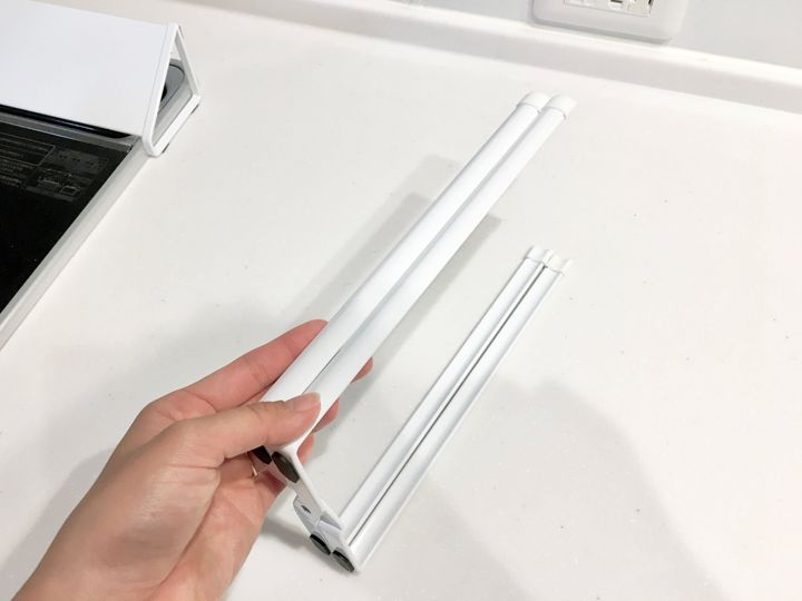 常に何かしら干しているのでしまう頻度は少ないですが、キッチンを広く使いたいときに折りたたんで置いておけるのは嬉しいポイントです。