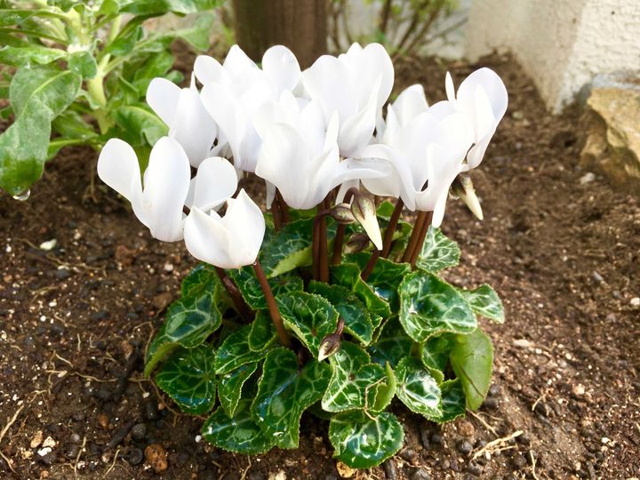 私は他のお花で色を使うので、ガーデンシクラメンはいつも白を選ぶことが多いかもしれません。濃い葉の色と透明感ある白い花びらとのコントラストが気に入っています。