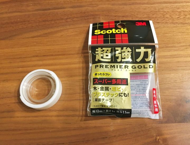 参考までに、使用した両面テープはこちら。スコッチの「超強力両面テープ プレミアゴールド スーパー多用途 」という商品です。ホームセンターで購入しました。