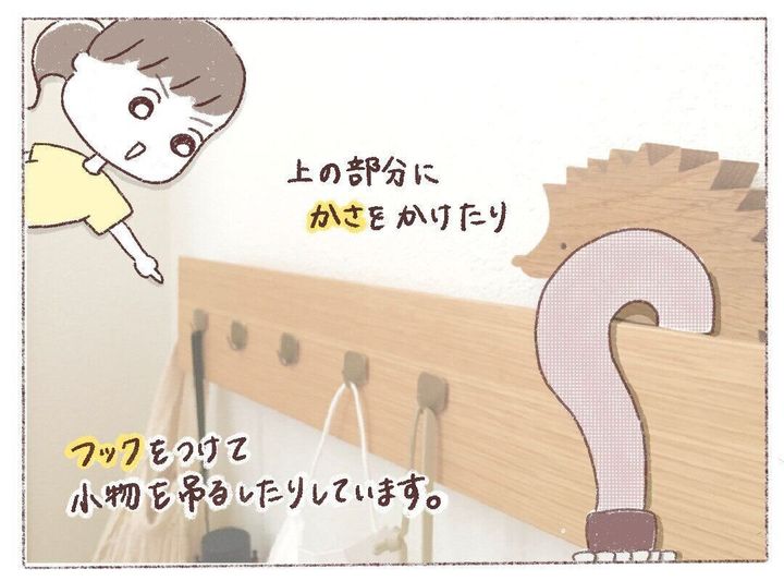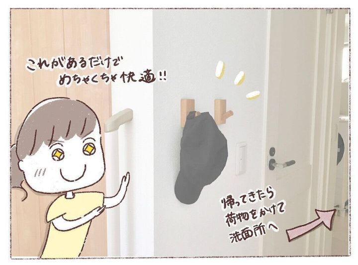 「帰宅後、このフックに荷物をかけたらすぐに手を洗う」という習慣づけにもなりますし、動線がスムーズなので無理なく続けることができています。