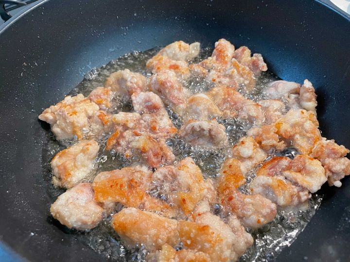 ②深さのあるフライパンに1〜2センチくらいの油を入れ、鶏肉とじゃがいもを揚げる。
