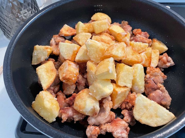 ③フライパンの油を拭き取り、じゃがいもと鶏肉をよりカリッとなるまで炒める。