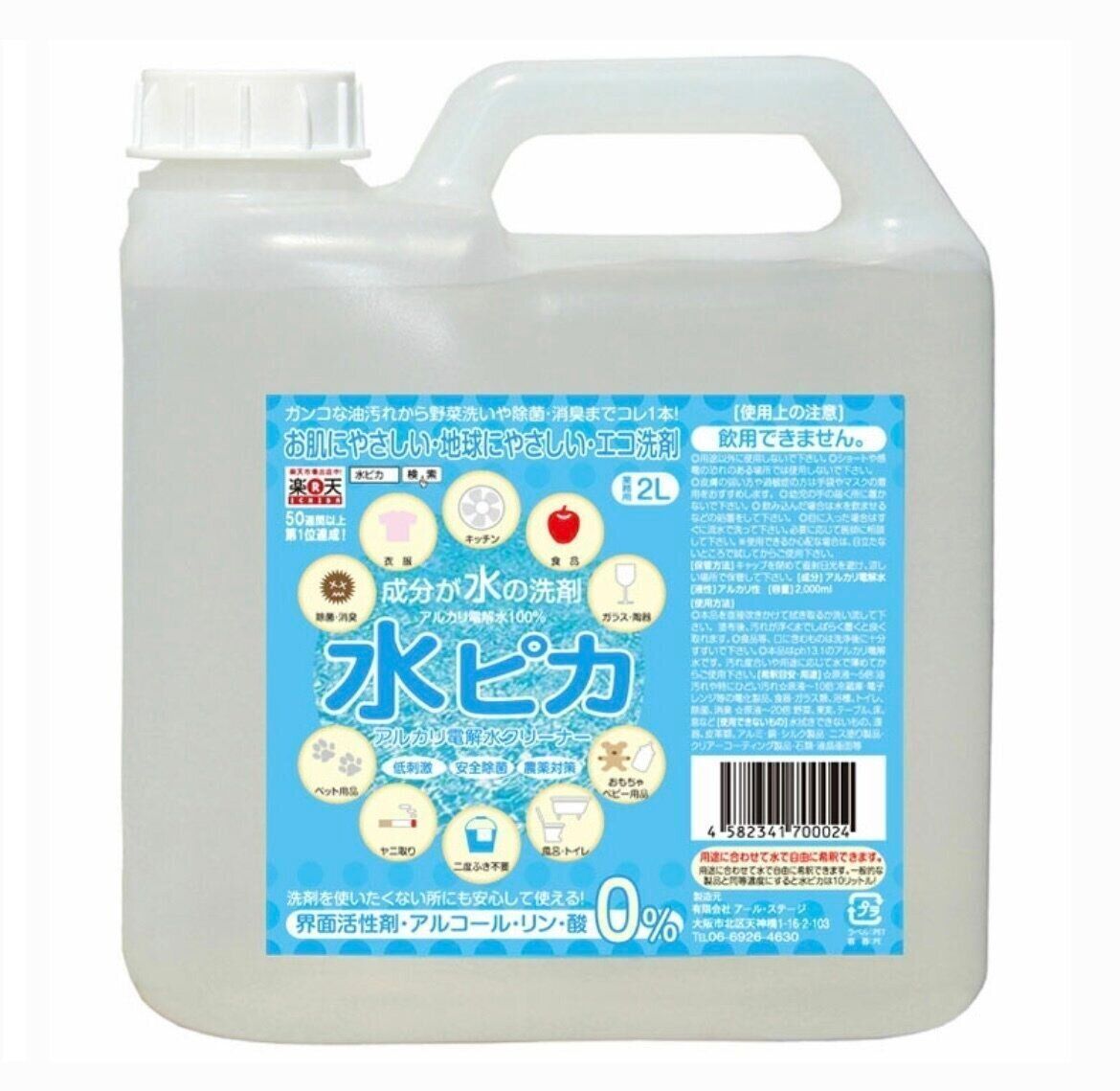 アルカリ電解水【水ピカ】は一般製品10リットル分が2リットルで、詰替タイプを主体としている為、プラスチック量が⅕に削減でき、界面活性剤やリン、酸、マイクロカプセルなどの化学薬品を使用していないので環境にも負担をかけずエコなのです。