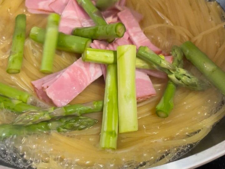 3.茹で時間2分前になったらアスパラとベーコンを入れ、中火にし水分がなくなるまで茹でる。