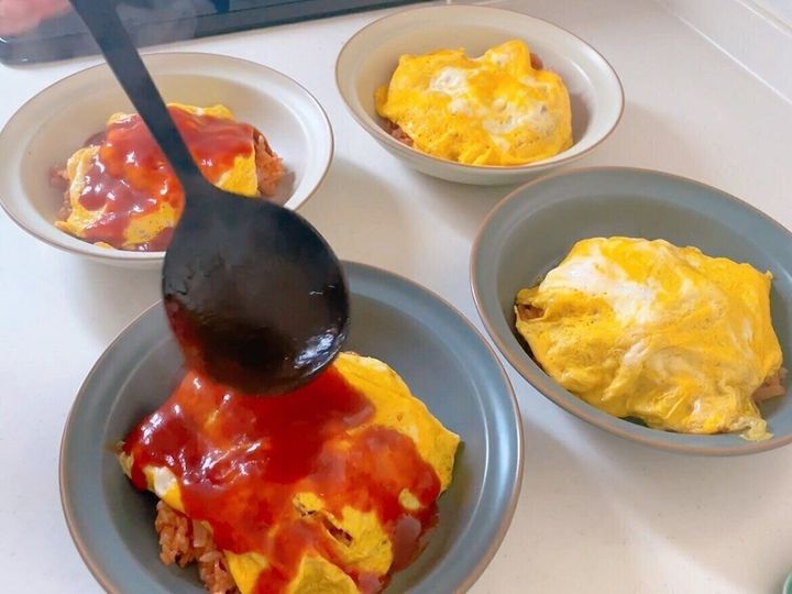 我が家のオムライスは、薄焼き卵の上にケチャップライスをのせてくるっとまるめるという工程も省きます。