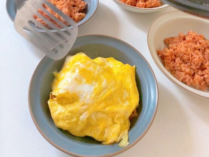 薄焼き卵を作ったら盛り付けてあるケチャップライスにサッとのせてしまうのです。