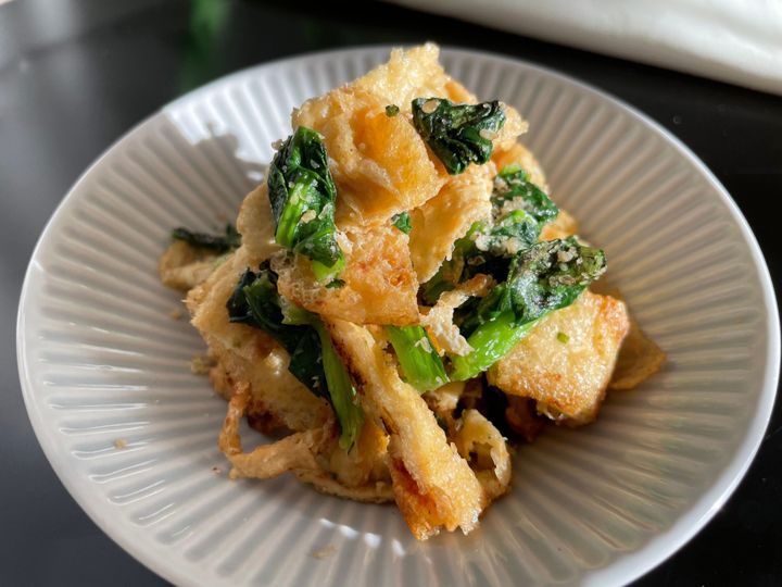 (2)油揚げの表面ががカリッとしてきたら、3cm幅に切った小松菜を入れよく炒める。