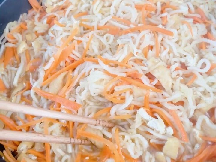 せんぎり大根、にんじん、油揚げを入れ炒める。