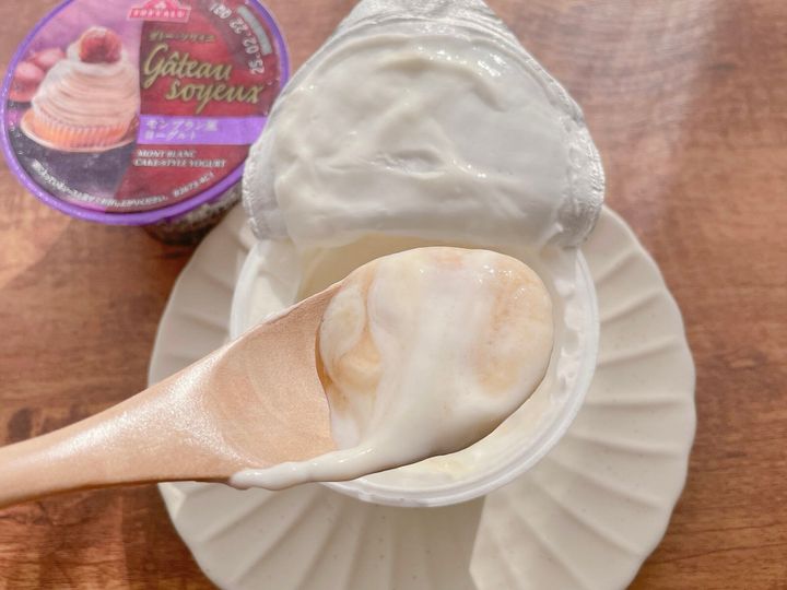 ヨーグルトのさっぱりとした酸味と、コクのあるマロンの甘さが、甘すぎず、後味もすっきりしているので、甘いものが欲しくなる食後のデザートや、小腹が空いた時の軽食にもぴったりです。