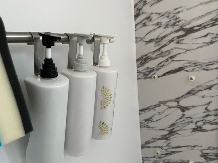 他にも、浴室掃除グッズも全て吊り下げ式に。
