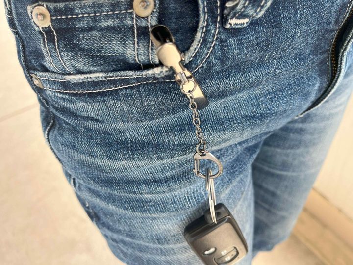 古紙のごみ出しなどで両手がふさがる時にもポケットから落ちる心配なくカギを持ち運べますよ。