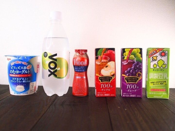右から調整豆乳、グレープ100%ジュース、アップル100%ジュース、乳酸菌飲料、無糖炭酸水、飲むヨーグルト(加糖)です。