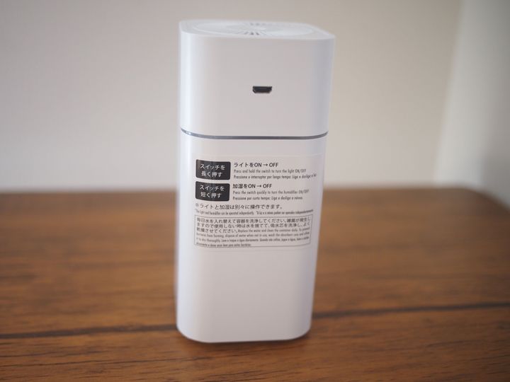 ボタンを長押しすると、加湿をしながらライトをつけることができます。寝る前に枕元にダウンライトとして置いておくのもいいですね。