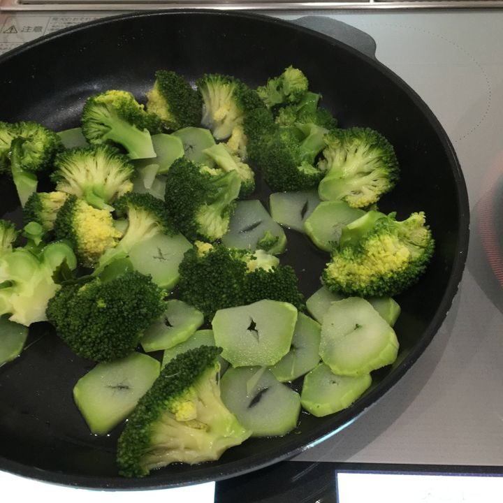 「蒸し茹で」は切った野菜をフライパンに入れて大さじ3くらいの水を入れて蓋をするだけです。野菜の種類にもよりますが数分すると、柔らかく茹で上がります。ブロッコリーはたった3分です。