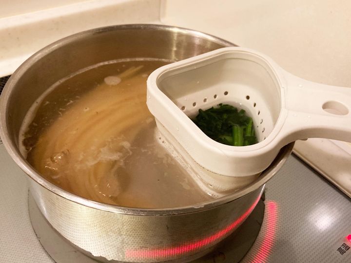鍋のフチに引っかけるフックが付いていて、メイン料理を茹でながら、細かい付け合わせを一緒に調理する事ができるので、時短になります。