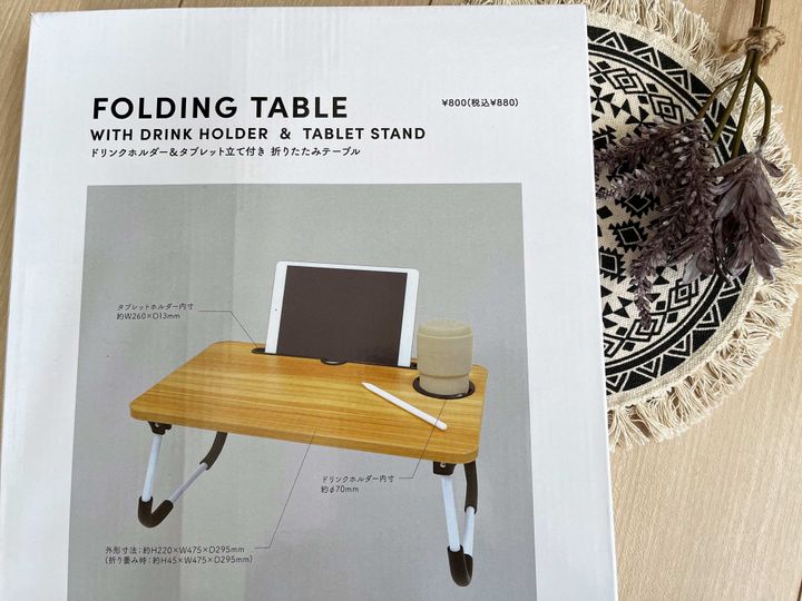 タブレット立てとドリンクホルダーまでつけて880円(税込)というコスパ最強の折りたたみテーブルが人気商品として話題を呼んでいます。