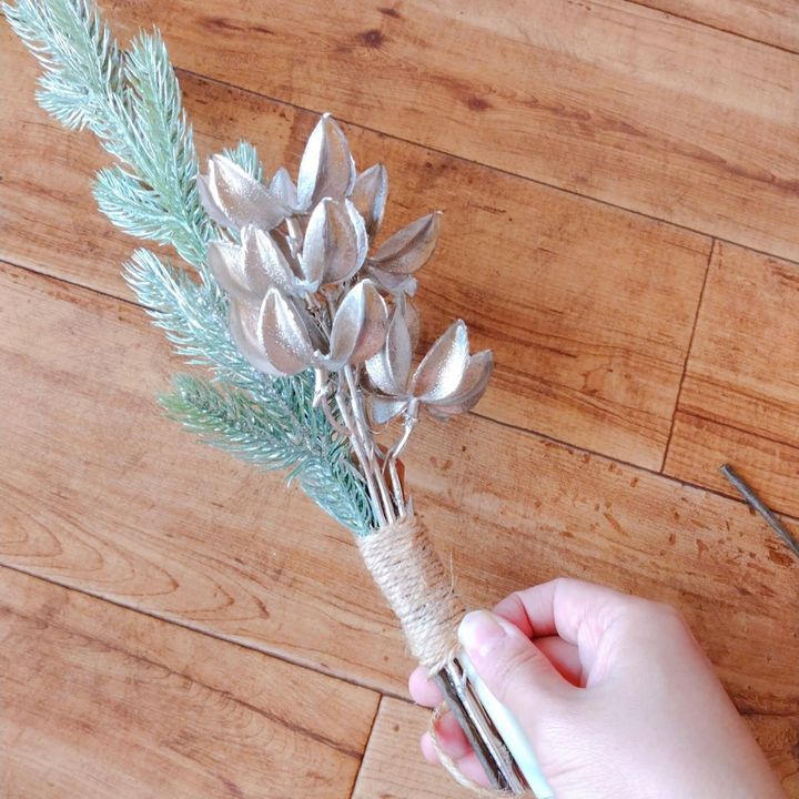 棒にお菓子をぶら下げるタイプを作るのでまず土台作りから。プラスチック感を消すために、突っ張り棒の両端に造花を付けて麻ひもでグルグル巻いていきます。