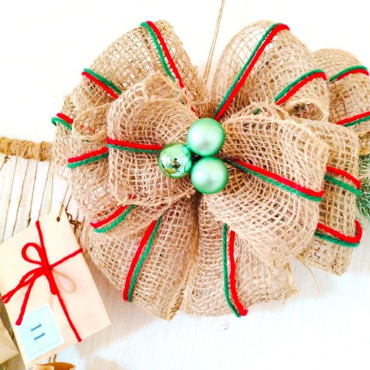 家にあった、ジュート(ホームセンターでひと巻200円ほど)と、毛糸を使ってリボンを作りました。DAISOに大きな赤いリボンもあったので、そちらもおすすめです。