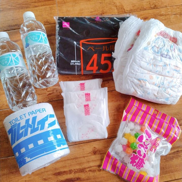 わが家では、子どもが小さいこともありトイレやノドの渇きはガマンできなかったのでオムツ、黒ビニール、トイレットペーパー、生理用品、水、金平糖は優先して入れています。