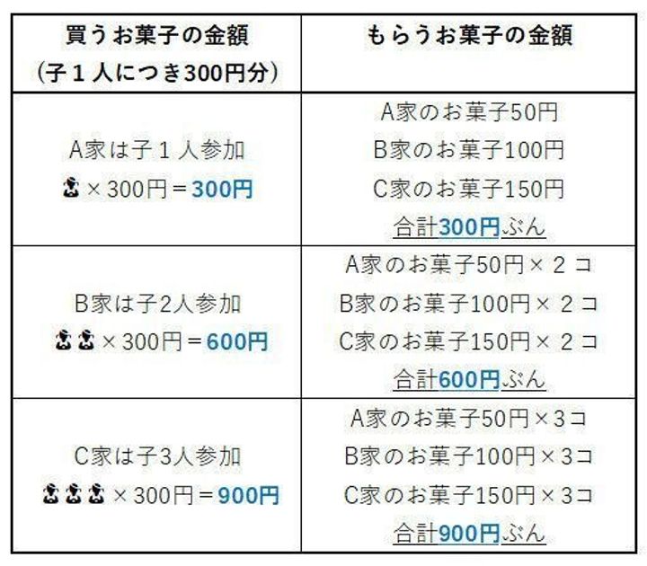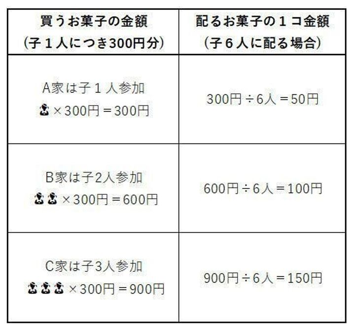 子どもの参加者は6人なので、配布するお菓子1コあたりの金額は、A家が50円、B家が100円、C家が150円。