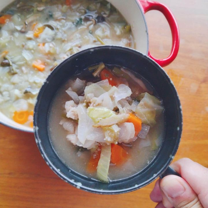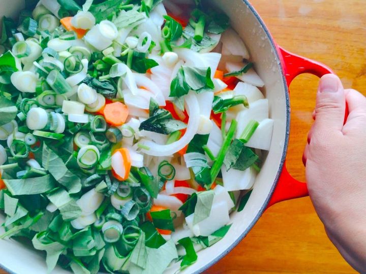 冷蔵庫に残っている野菜を全部入れられるので、在庫の一掃もできるうえ、どんな野菜を入れてもおいしいので、テキトーにつくっても失敗しない安心のメニューです。